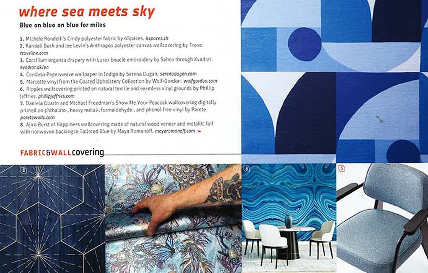 In the fabric and wallcovering section "Where Sea Meets Sky" featured Ripples 9268-B Bookmatched Blue On Calla White Vinyl Abaca