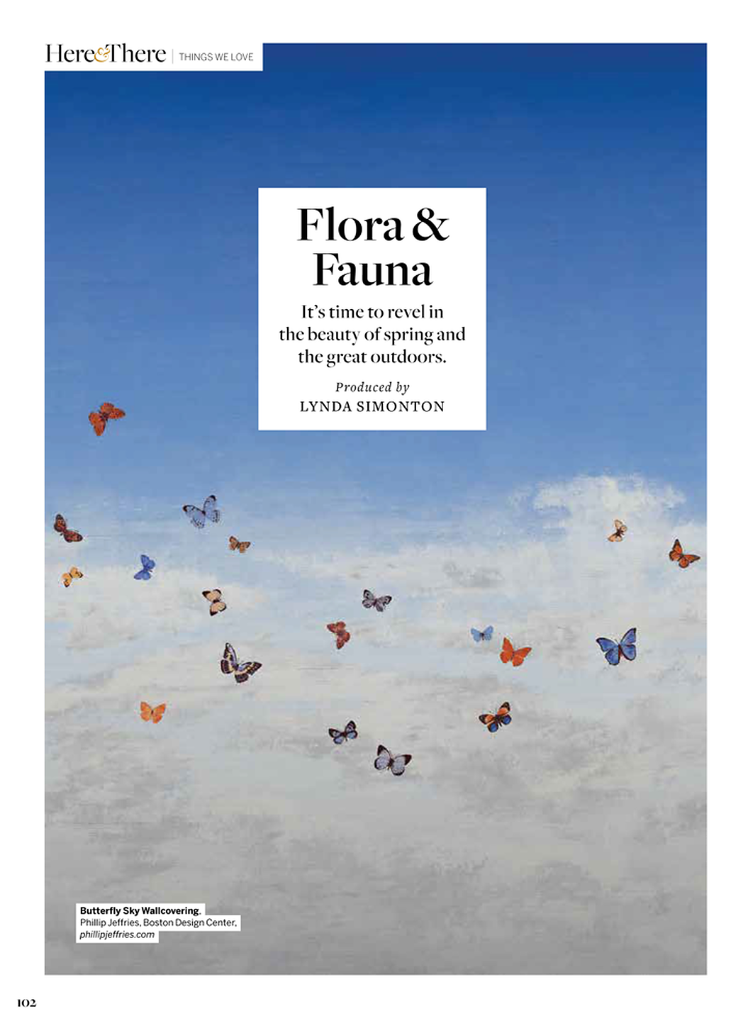 In article, "Flora and Fauna," Butterfly Sky 9669 Blue Morpho on Supernova White Star Dust Silk is featured on the opener page of a spring & outdoor product feature.