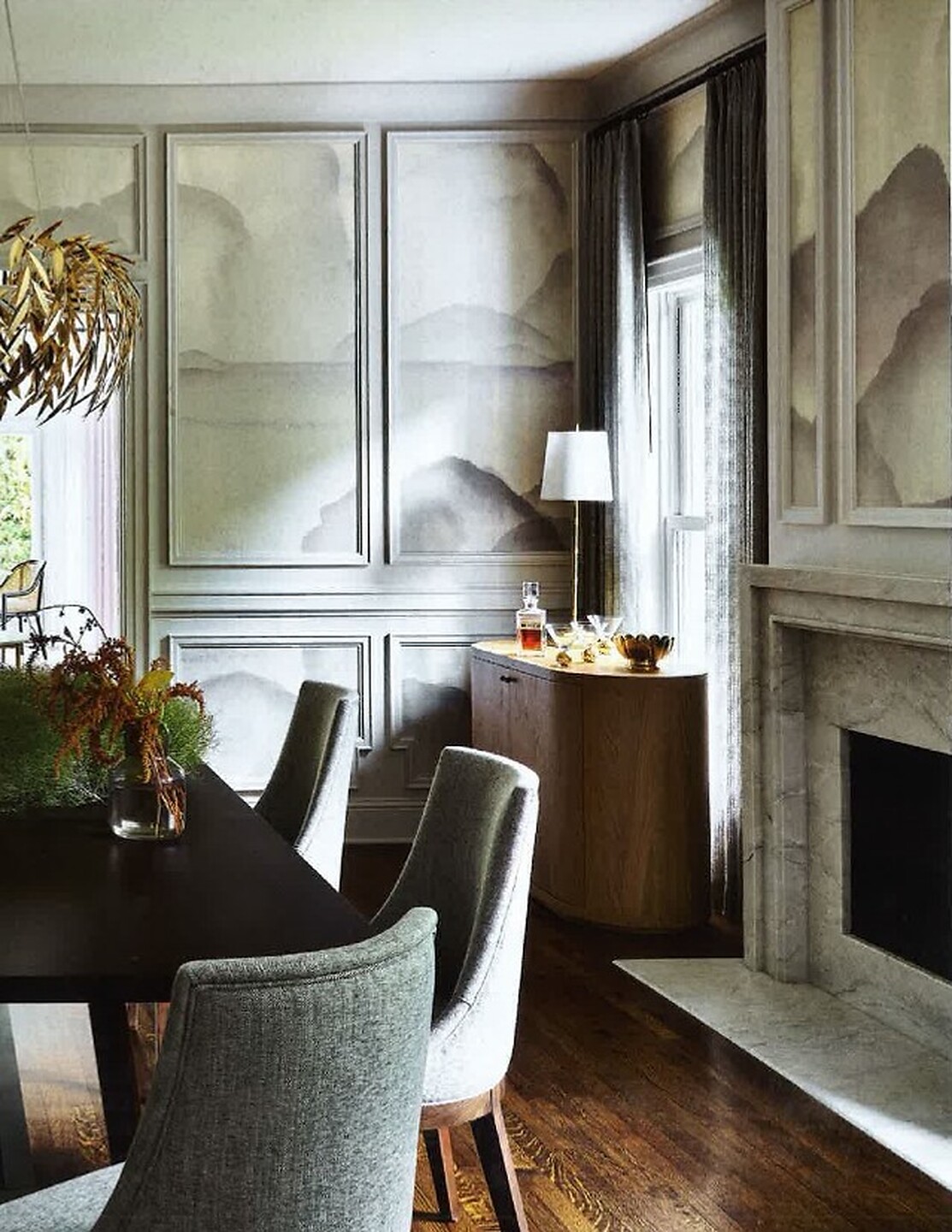 In article, "Relaxed Refinement," interior designer Hayley Kauffmann of Hayley Maureen featured Mist 4794 Whisper in the dining room and Arboretum 5581 Dawn on Once Upon A Grey Vinyl Mirror Mirror in the lounge of a client's home.