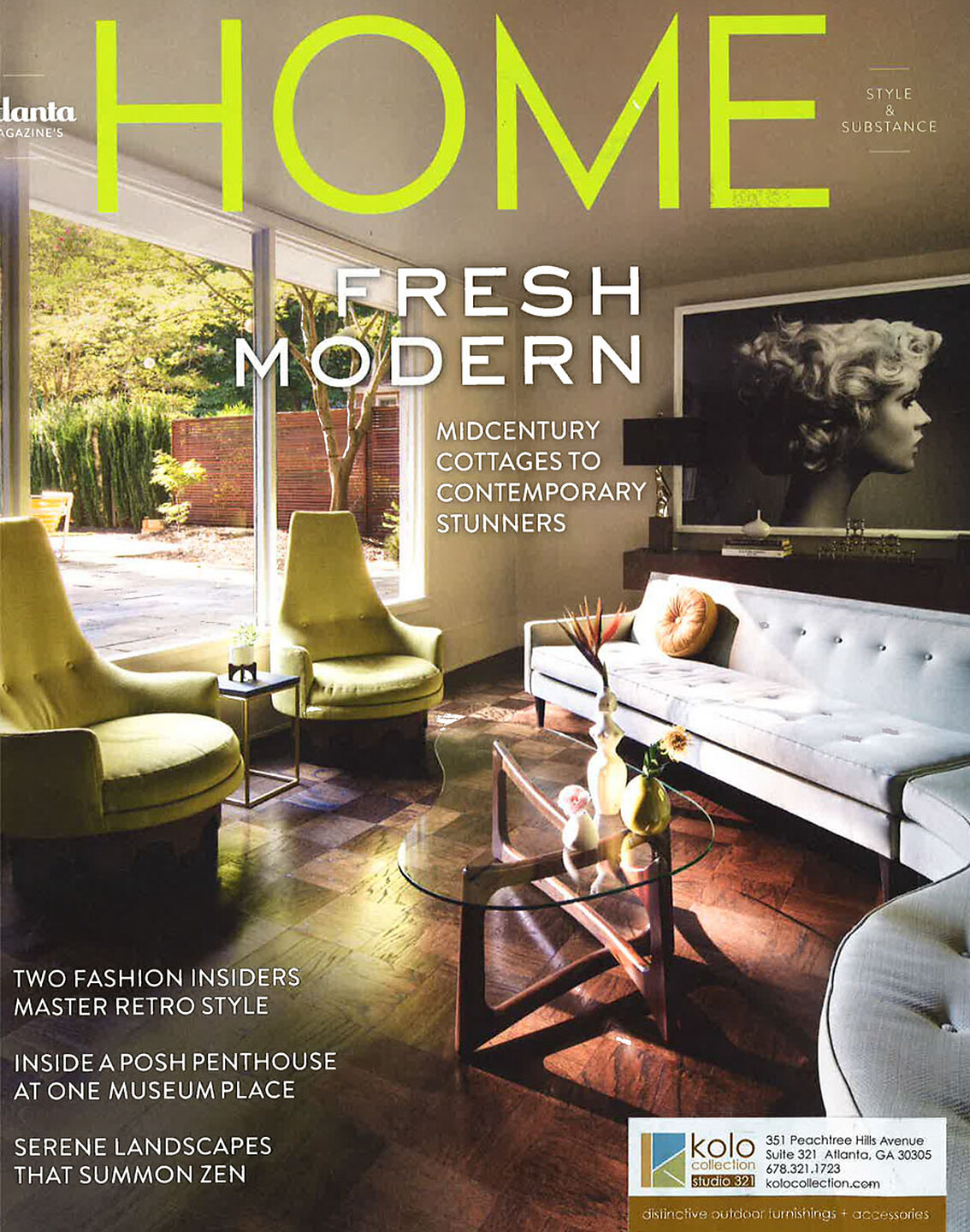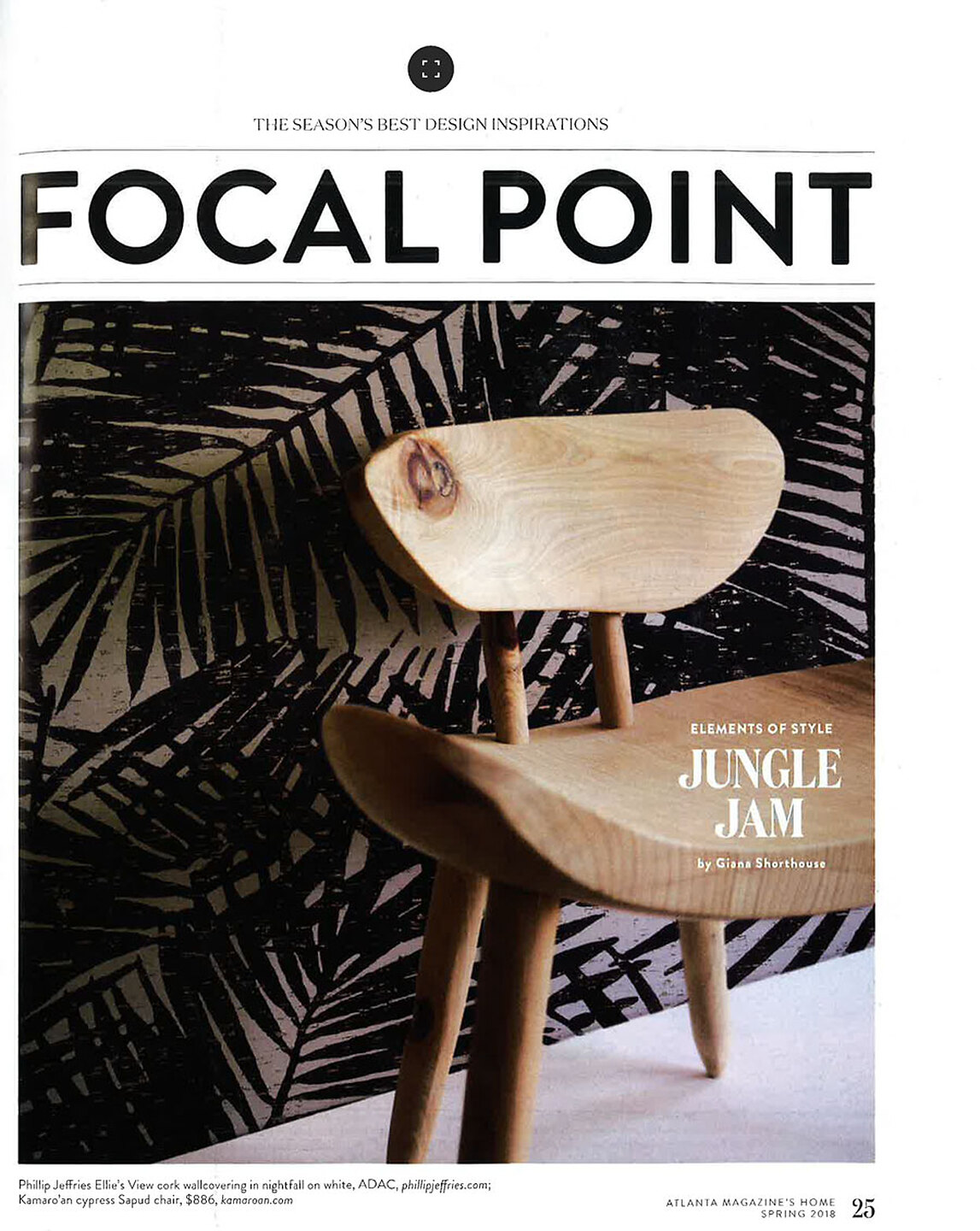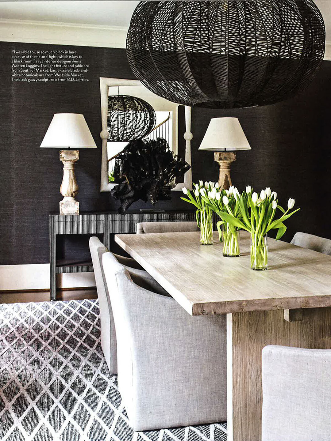 In article, "Focal Point," Ellie's View 7153 Nightfall is featured as an element of style and in article "High Contrast," Interior designer Anna Wooten Loggins featured Tailored Linens 5357 Grey in the dining room of a client's home.